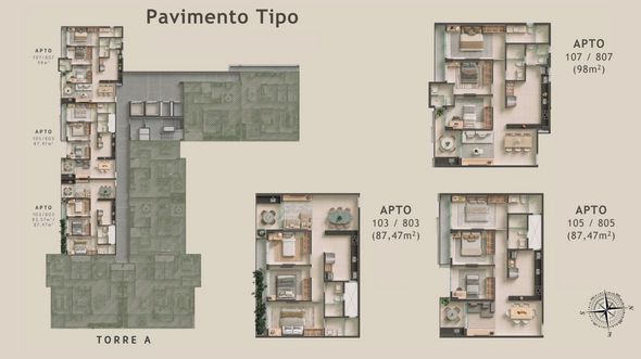 - Aptos de 2 e 3 quartos: (65m2, 85m2, 107m2)